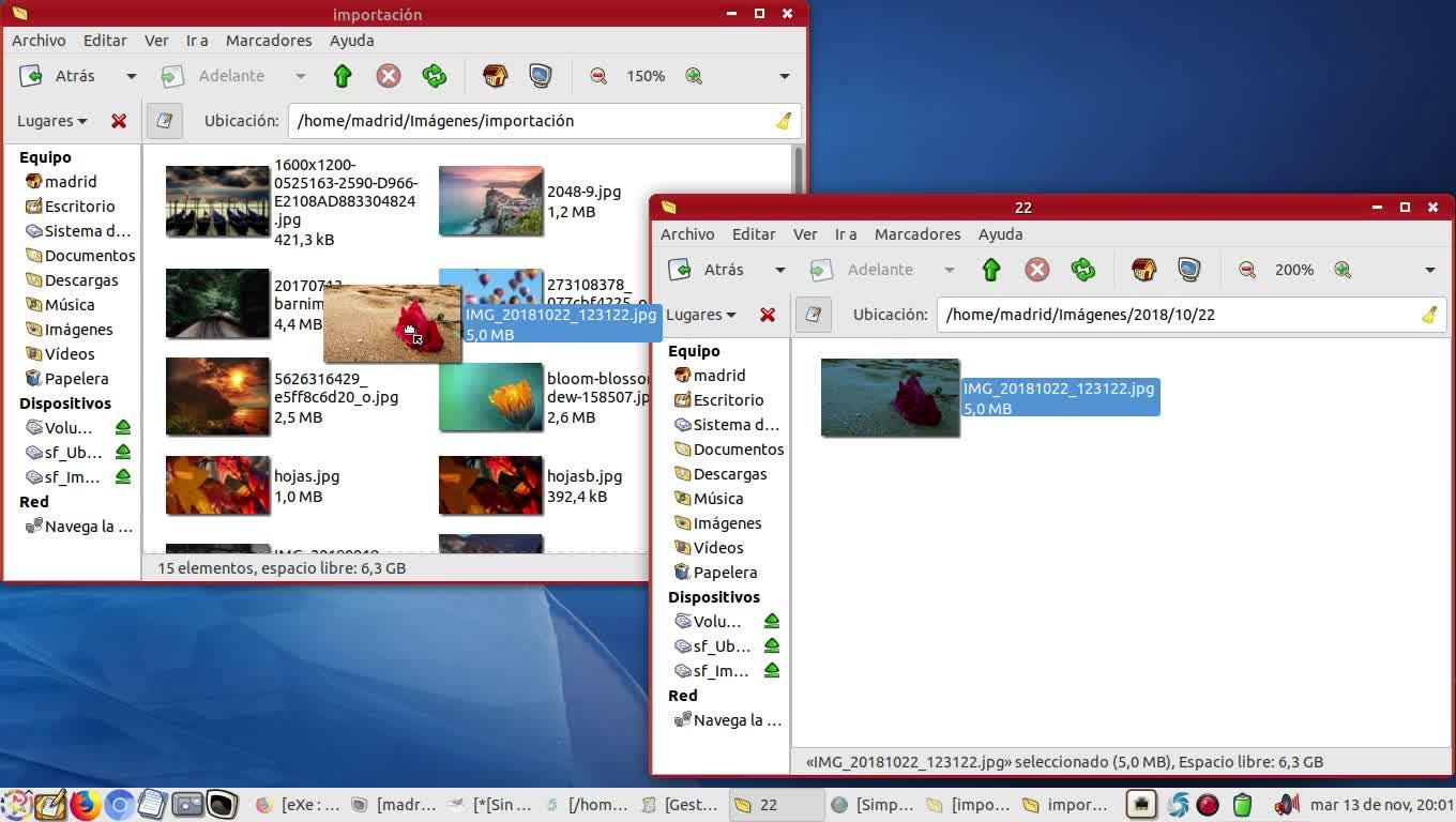 Voy a hacer clic sobre mi carpeta personal, abro el directorio de imágenes y dentro de él el directorio de importación. Si pulso en esta imagen y la arrastro a esta ventana, voy a encontrar que la imagen se ha movido aquí porque ha desaparecido del original.