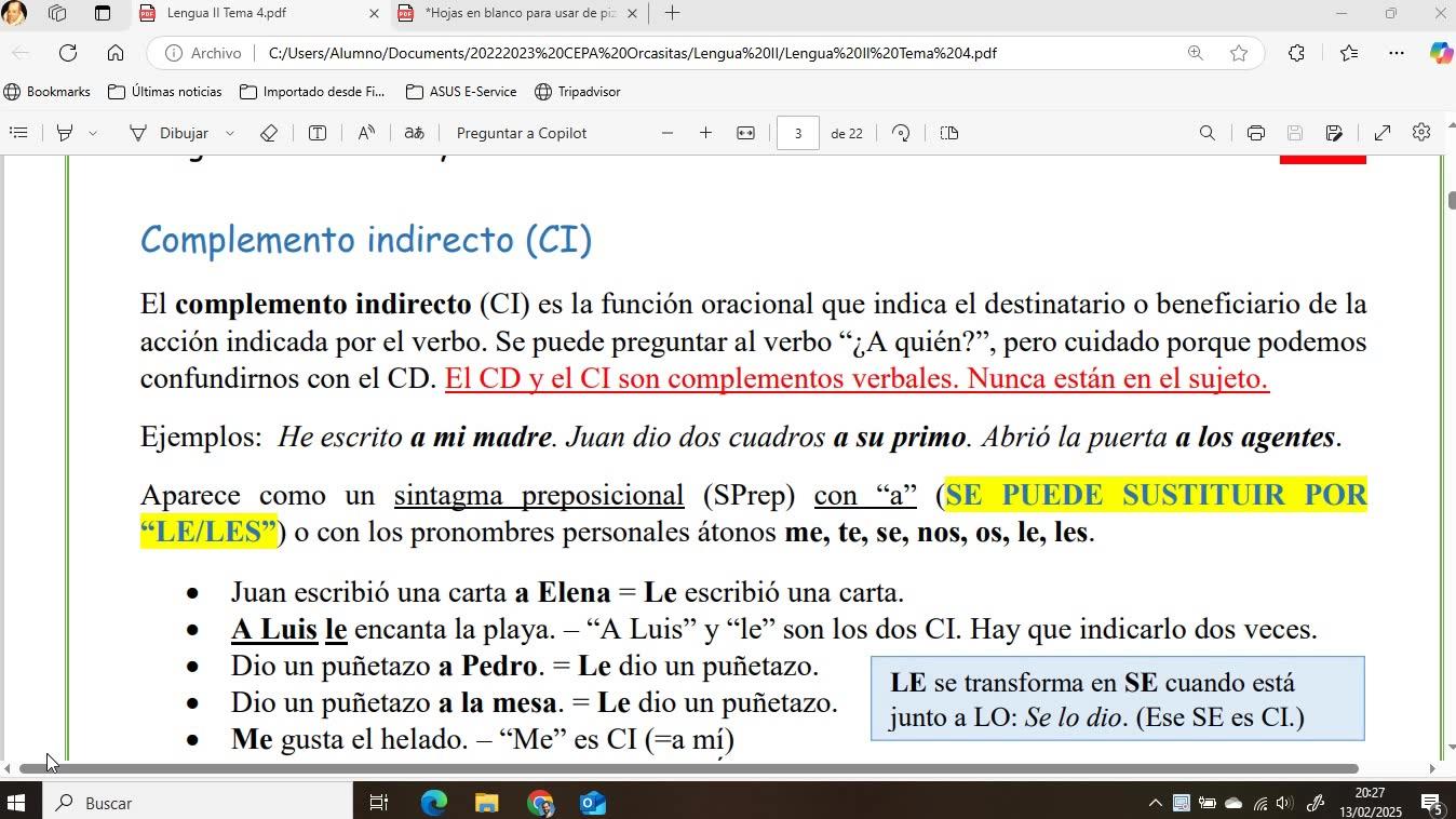 ¿De acuerdo? Bueno, pues nada más. Esto ha sido todo por hoy, que ha sido bastante, pero hemos hecho todo lo relativo al complemento indirecto de nuestros apuntes en estas hojas que les podré facilitar a los compañeros que me las pidan. Muchas gracias y nos vemos en el siguiente vídeo.
