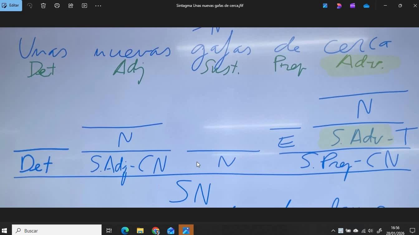 Por ejemplo, en esta oración, unas nuevas gafas de cerca, perdón, oración, sintagma, estamos analizando sintagmas, vemos algunas cosas interesantes. La principal es que tenemos un adjetivo, unas nuevas gafas de cerca.