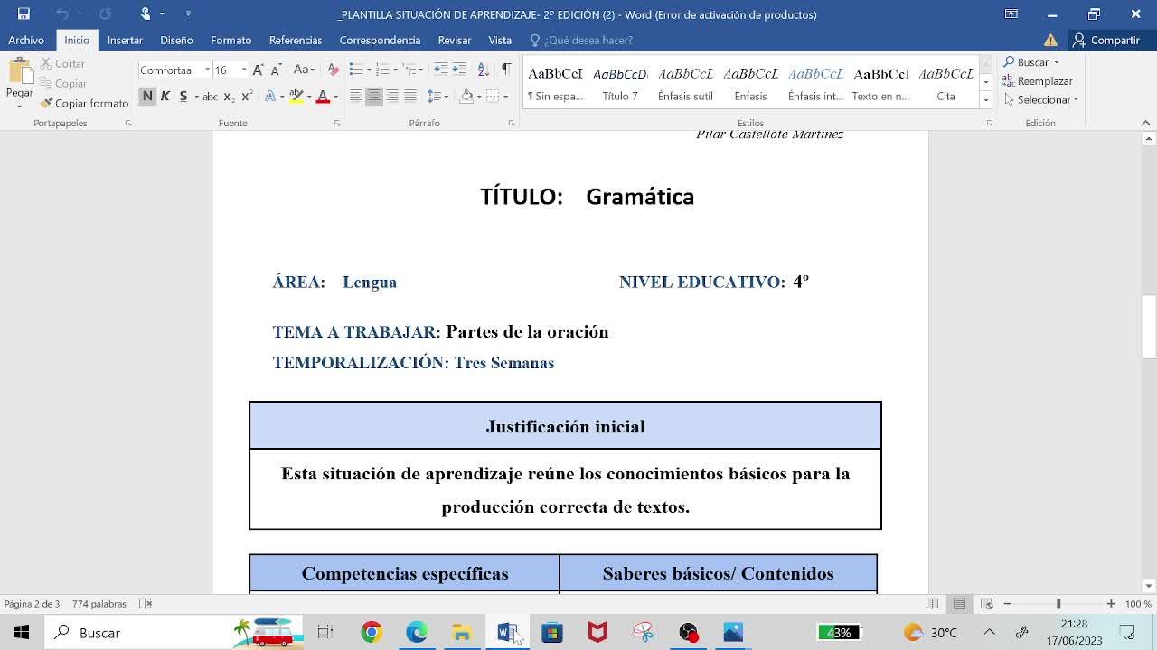 Está dentro del área de lengua, gramática, partes de la oración y la temporalización serían tres semanas.