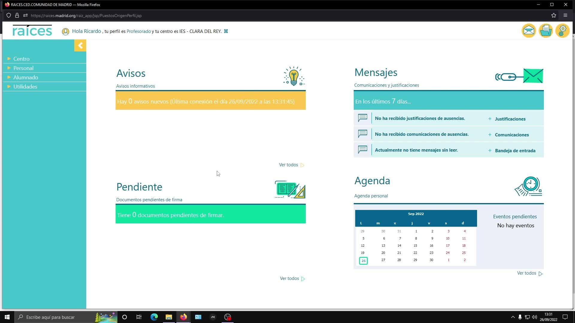 Si nosotros entramos en Raíces, vemos este menú, nos vamos a Personal, Horario y Horario