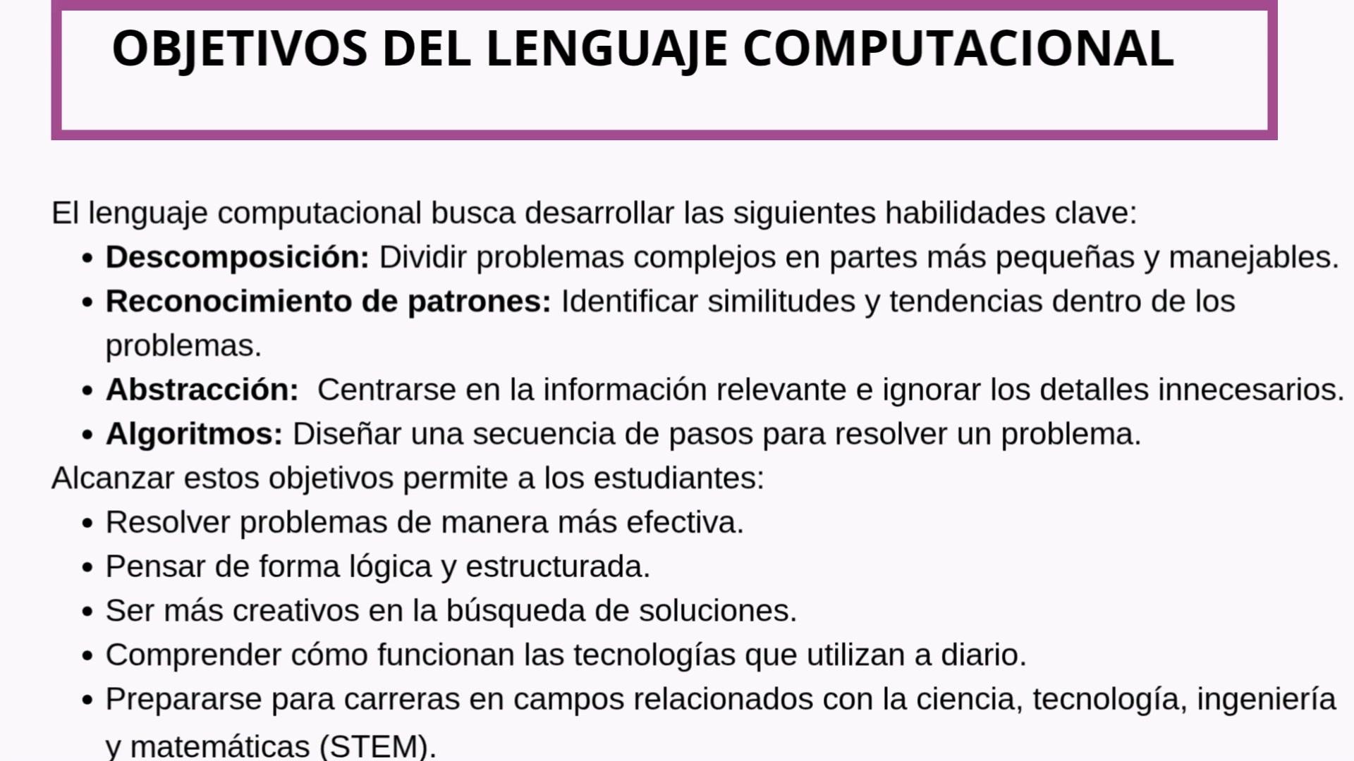 El lenguaje computacional o pensamiento computacional es un conjunto de habilidades de resolución de problemas que involucran descomposición, reconocimiento de patrones, abstracción y algoritmos.