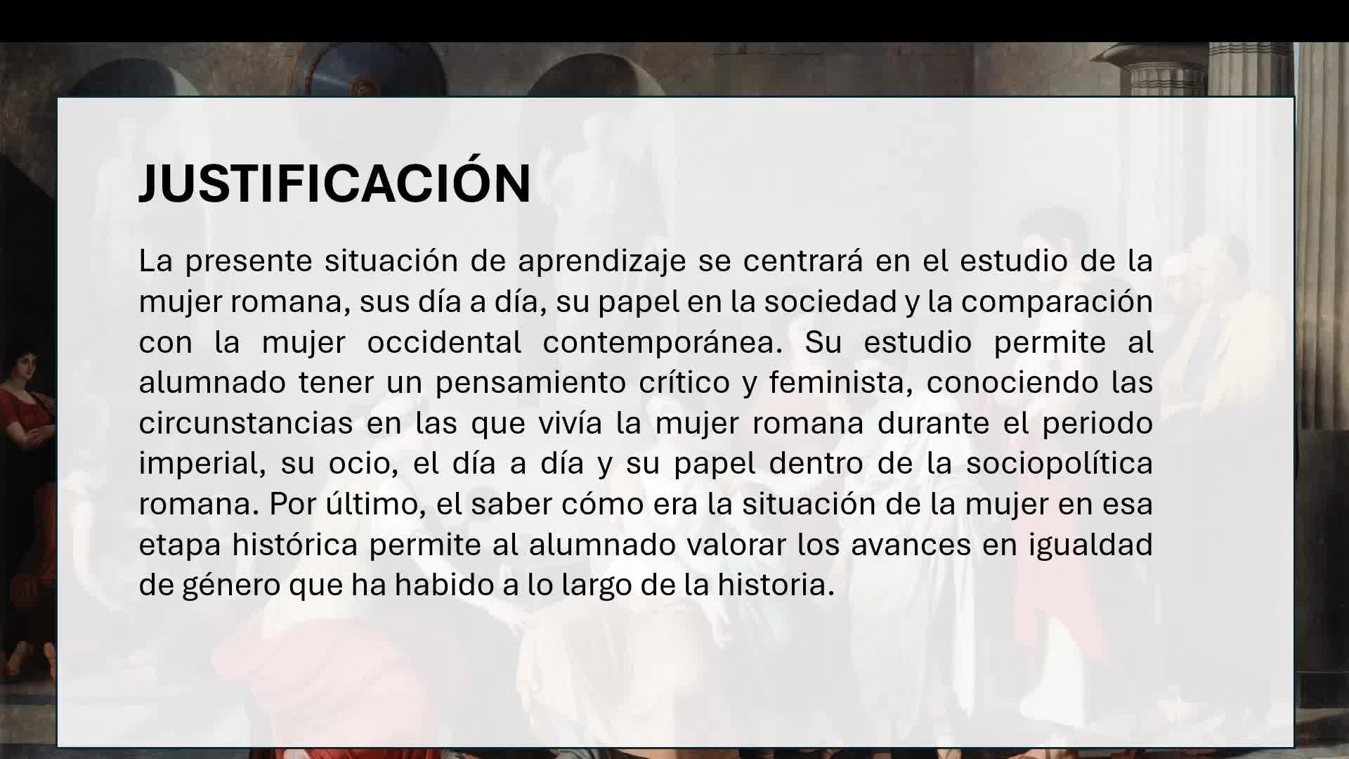 Efectivamente, a la hora de justificar este tema nos vamos a adentrar sobre todo en el estudio de lo que es la situación de la mujer romana
