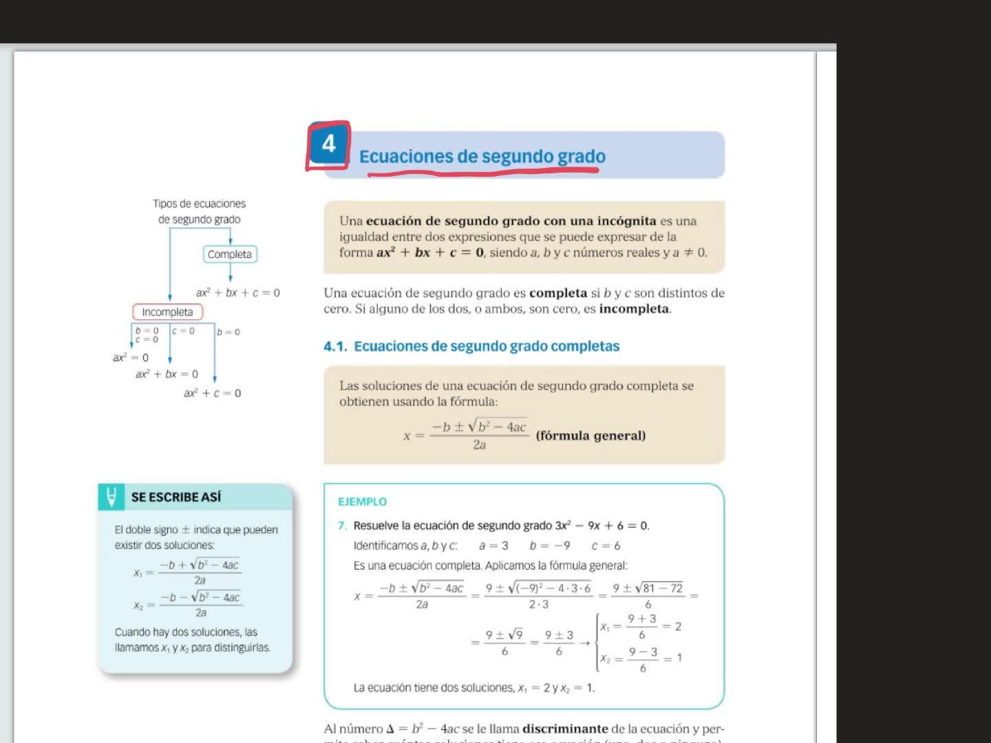 Hola a todos. Una ecuación de segundo grado, vemos aquí, en el bígrafe 4, vale, ecuaciones