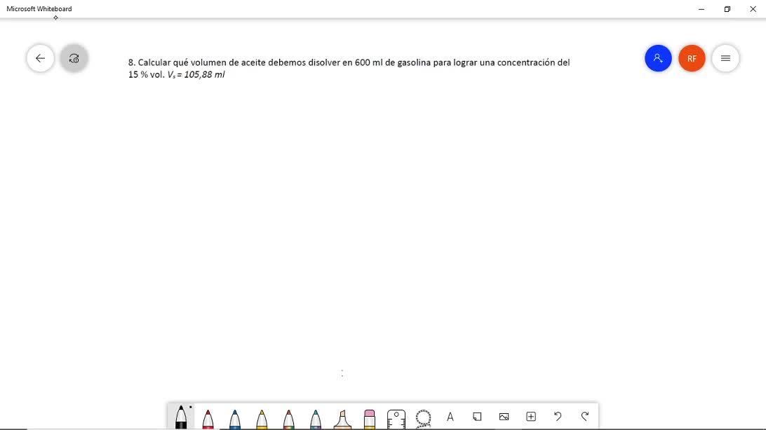 El problema número 8 dice, calcula qué volumen de aceite debemos disolver en 600 mililitros de gasolina para lograr una concentración del 15% en volumen.