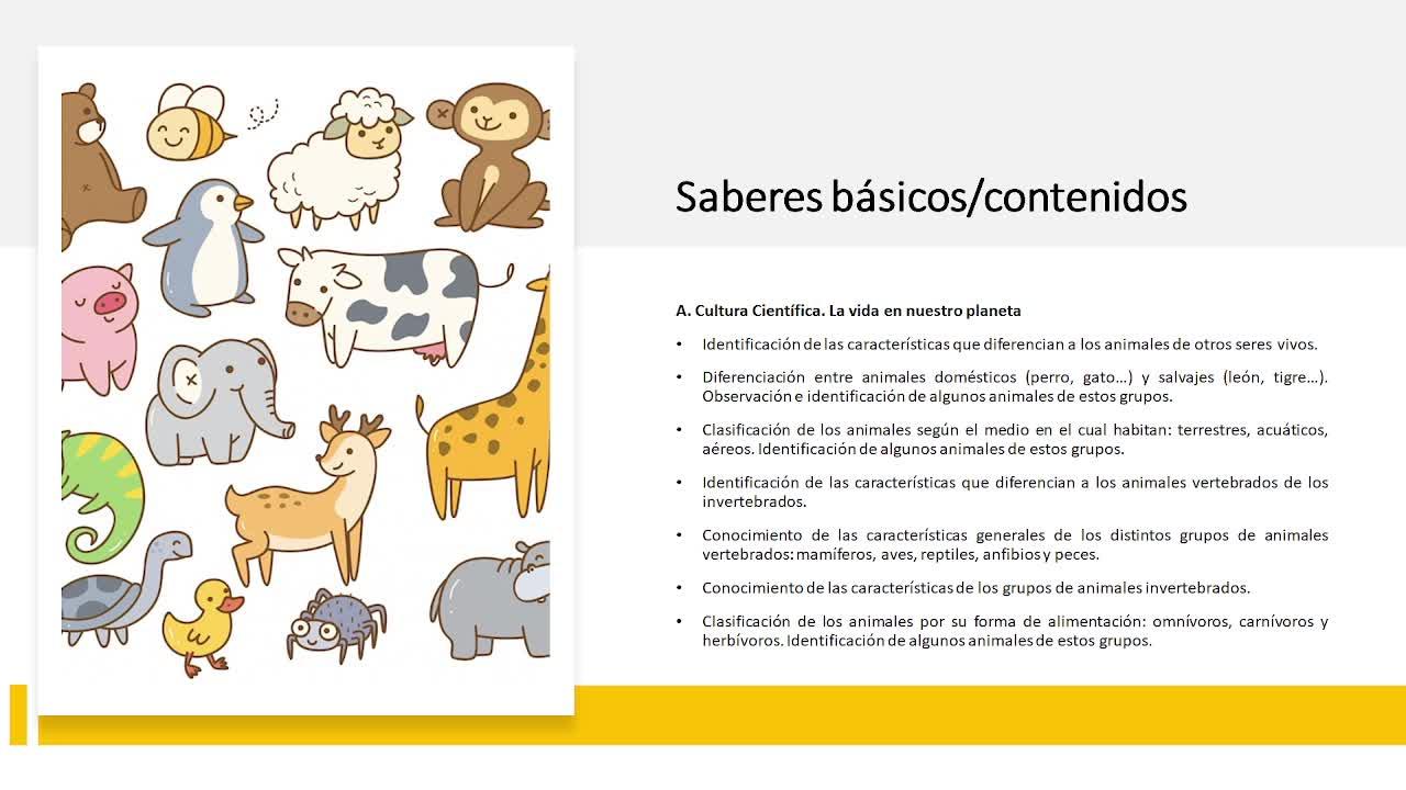 En cuanto a los saberes básicos contenidos, pues trataremos la identificación de las características de los animales, si hay animales domésticos, si hay salvajes, que los identifiquen, los clasifiquen y los reconozcan.