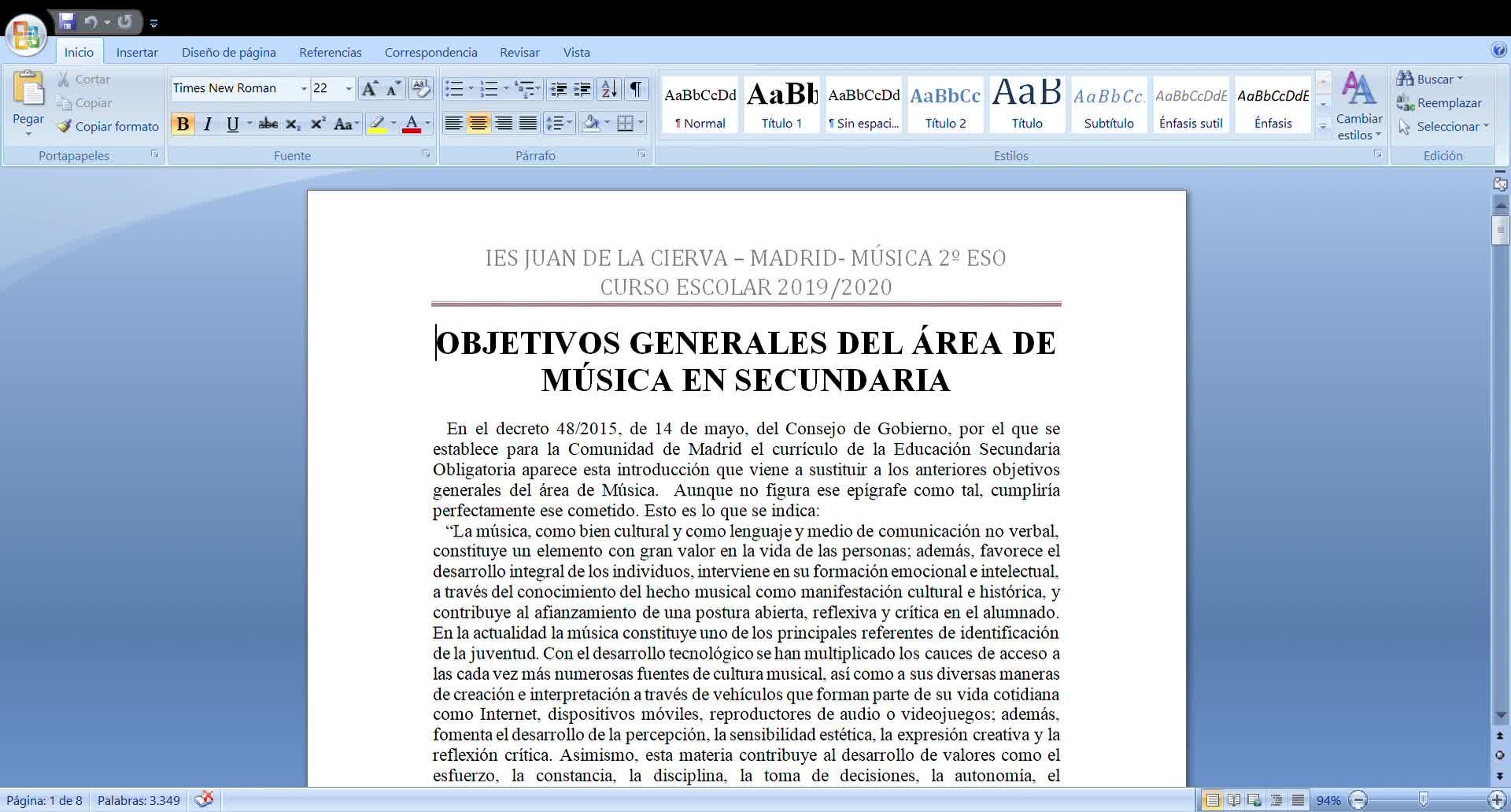 Bien, tenemos delante, estáis viendo, estoy viendo yo en mi pantalla y por extensión en la vuestra, la programación didáctica de la asignatura de música en segundo de secundaria.