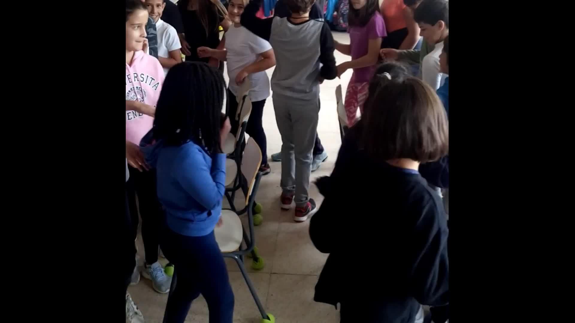 Son veinticuatro alumnos para estar subidos encima de cinco sillas sin que nadie esté en el suelo.