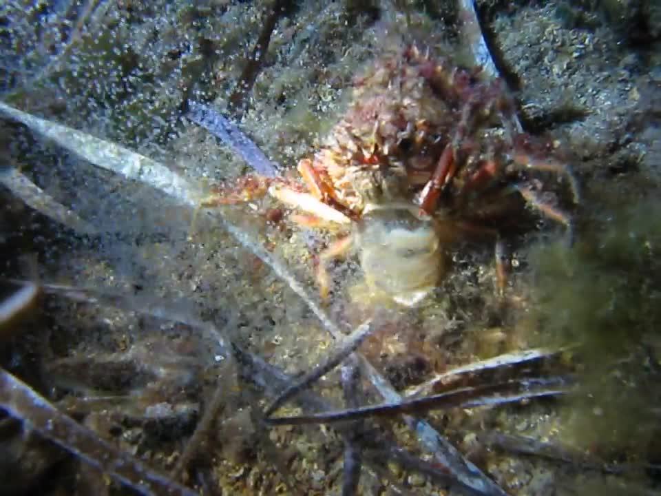 Una centolla liberando los huevos en la columna de agua