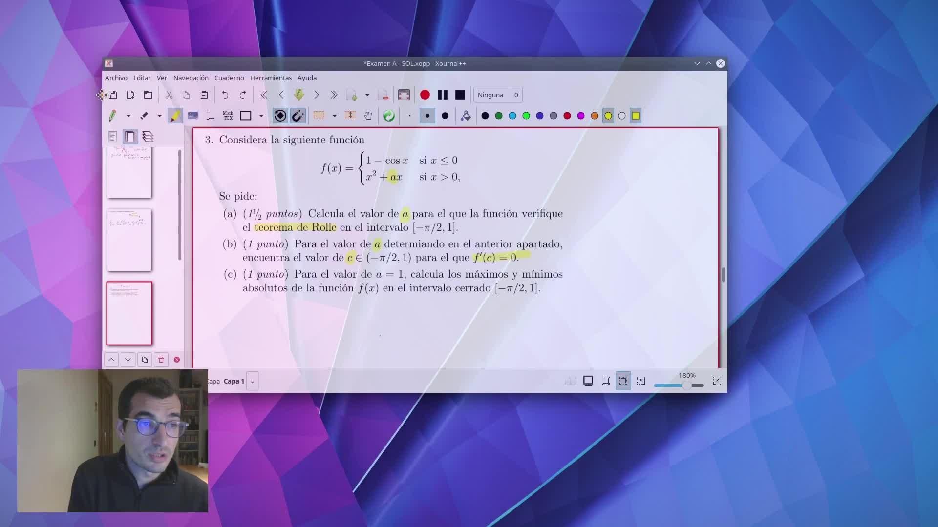 Bueno, estamos en este ejercicio, en el tercero de este examen, que en este caso es un ejercicio del teorema de Rolle.