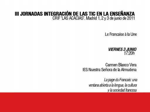 Ponencia de Dª Carmen Blanco Vera: "La page du Français: una ventana abierta a la lengua, la cultura y la sociedad francesa" realizada en las III Jornadas de Integración de las TIC en las Enseñanza, el 3 de junio de 2011.