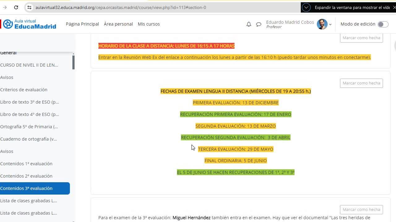 Pues estamos a día 20. El miércoles que viene es el examen. O sea, nos quedaría en directo la clase de hoy y la del lunes 27.