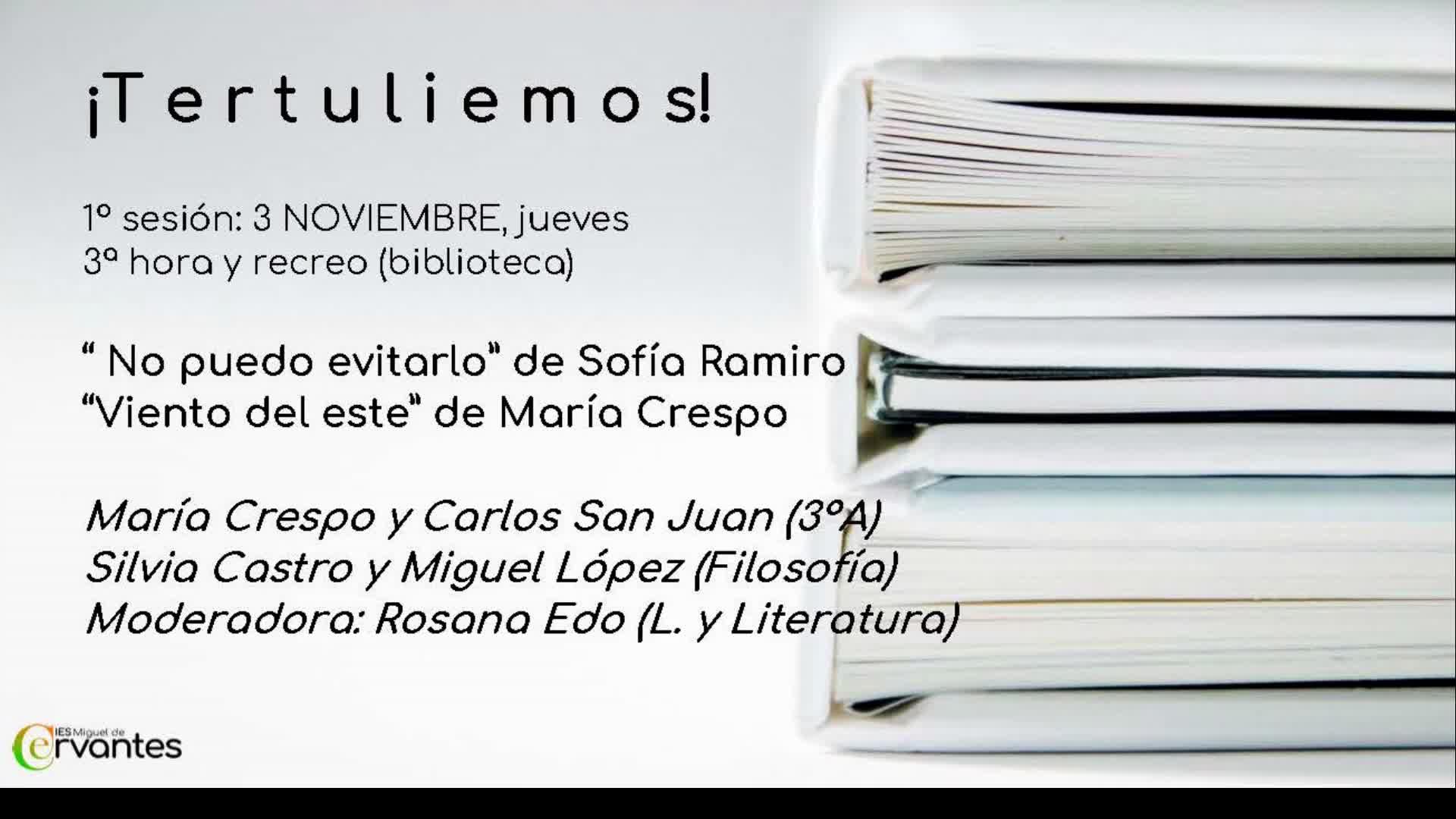 Queda inaugurado, el 3 de noviembre, el I Ciclo de Tertulias del IES Miguel de Cervantes: ¡Tertuliemos!, con un cartel de lujo, dentro del Proyecto de Reactivación de nuestra Biblioteca. Los participantes leen y comentan dos poemas publicados en la revista de nuestro centro "El curioso impertinente".