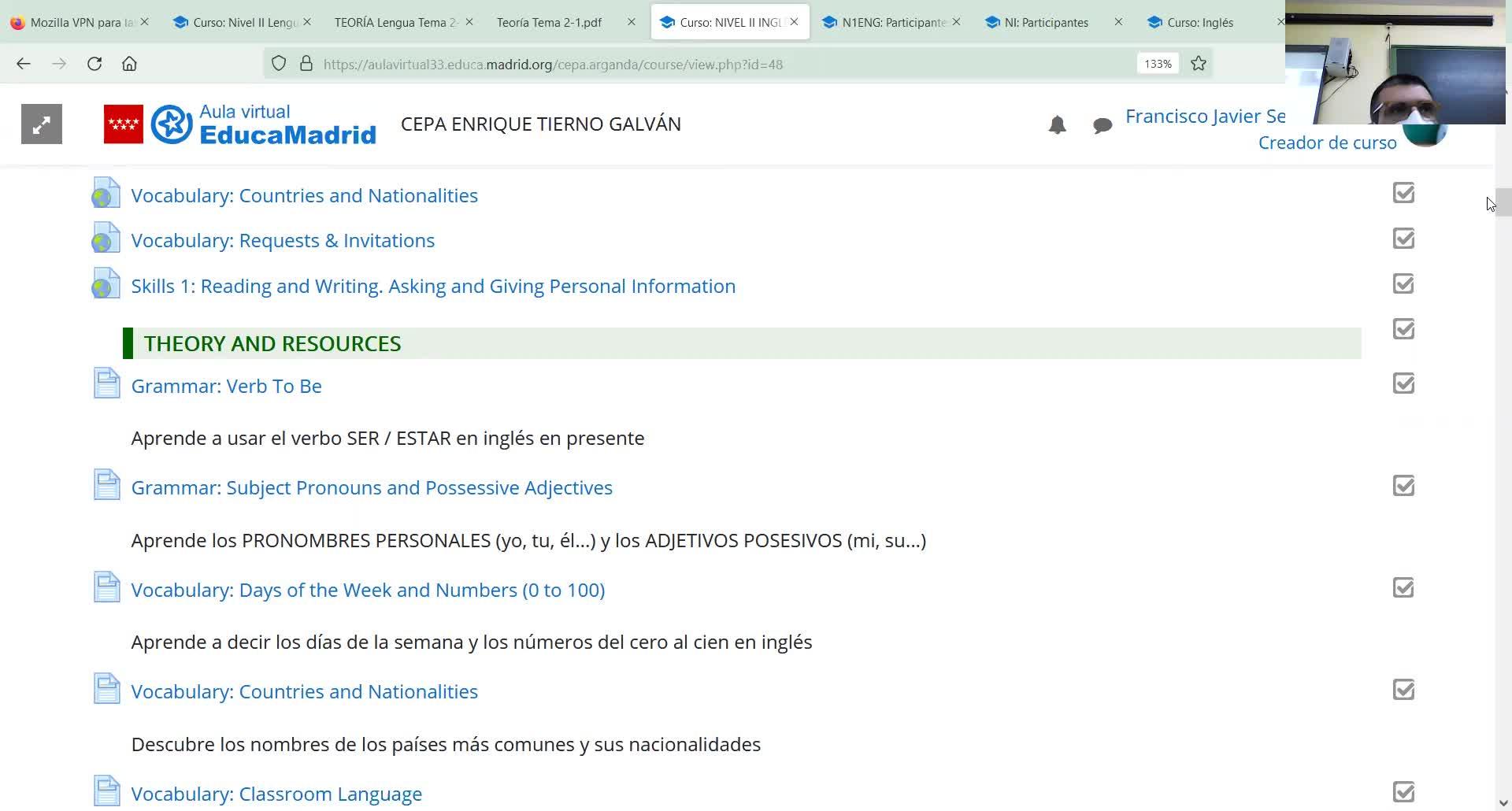 Bueno, empezamos en inglés con el tema 1, claro está, y con el verbo to be, que no me voy a detener, es decir, es que a estas alturas no voy a hacer un recorrido, es que ni siquiera lo voy a mostrar, porque ya el verbo to be es básico y debes de conocer la afirmación, la negación, la pregunta.