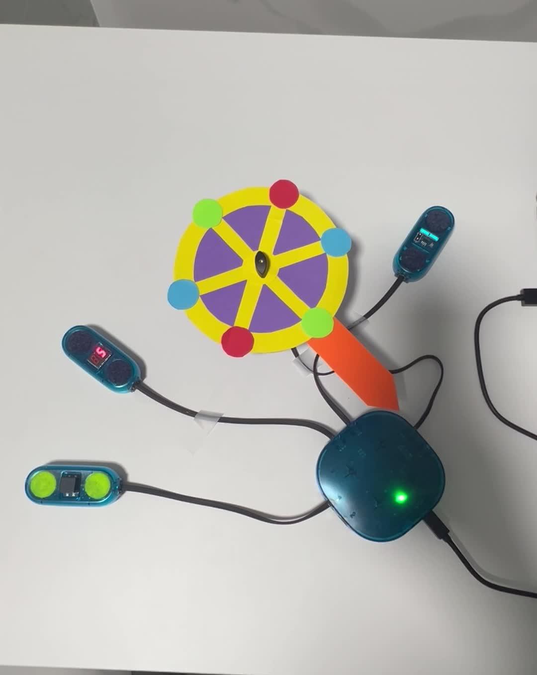 Proyecto creado para Retotech con el programa Bitbloq. La noria se activa con un pulsador. Se cuentan las vueltas con un sensor y display. Led rojo en funcionamiento.