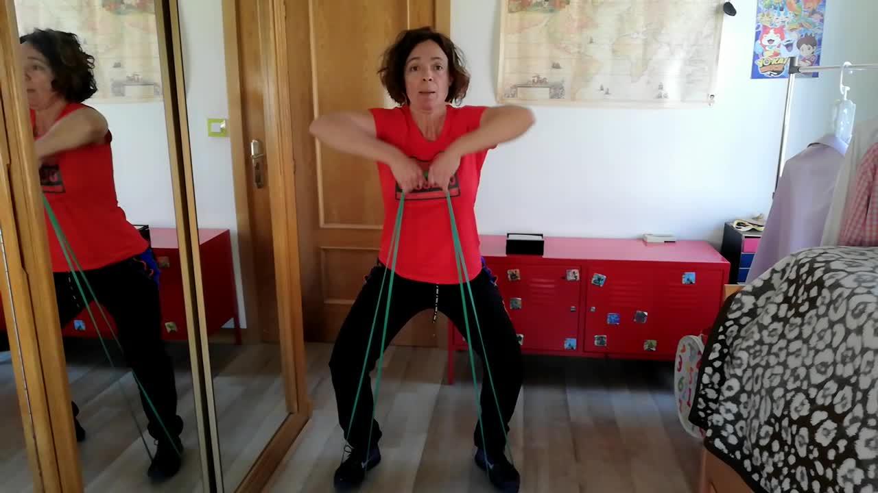 Now we are going to combine to exercise with the elastic. Squats and high pull. For the squats I will step on both sides, both ends of the elastic and to regulate intensity I will grab wider or narrower. This is less intense.