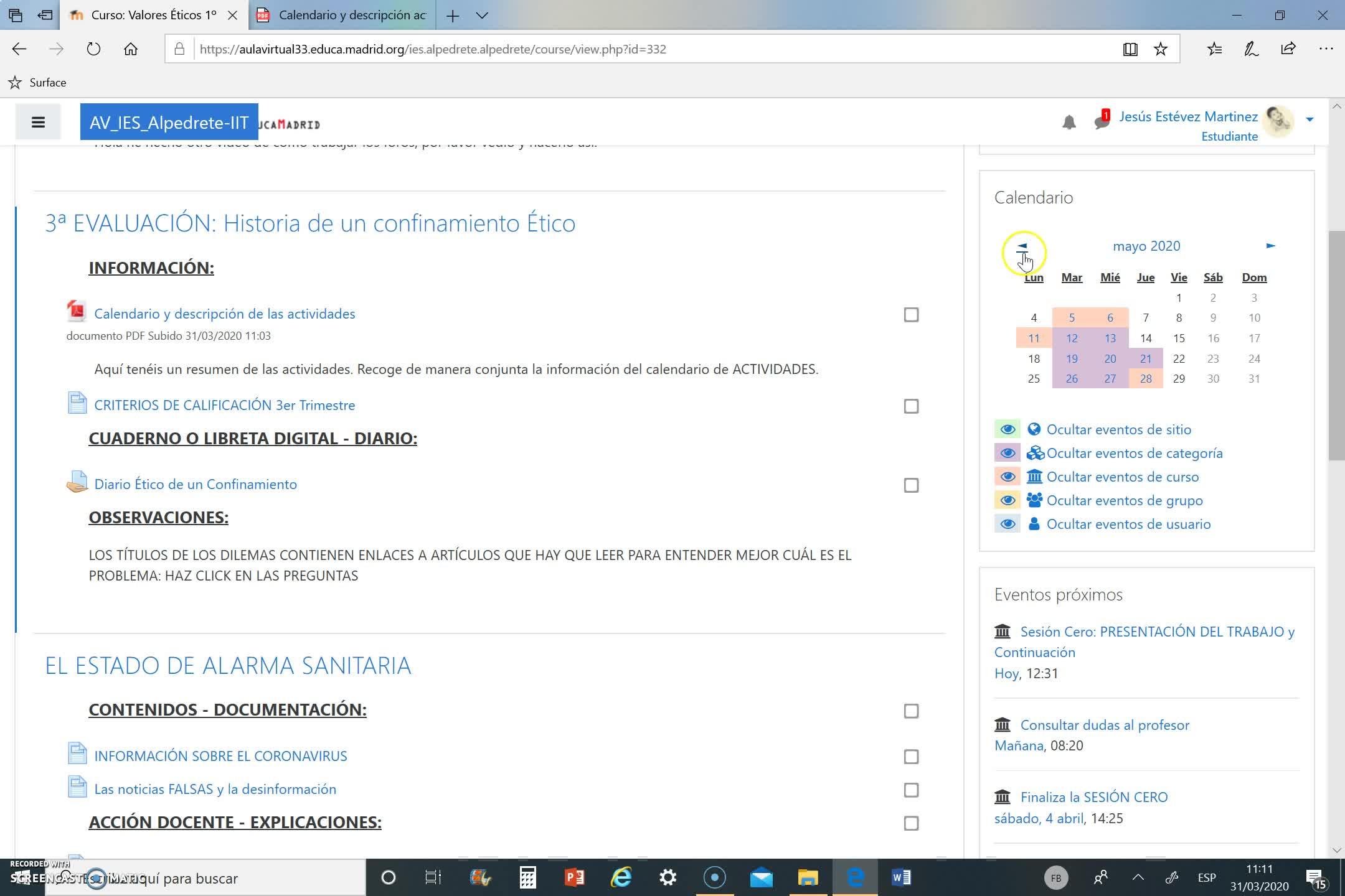 Y de esta forma es mucho más fácil porque queda el calendario fuera del aula digital. Yo lo tengo aquí porque como lo tengo en el ordenador lo he descargado para que vayamos viendo cómo el calendario funciona como guión del diario ético de un confinamiento.