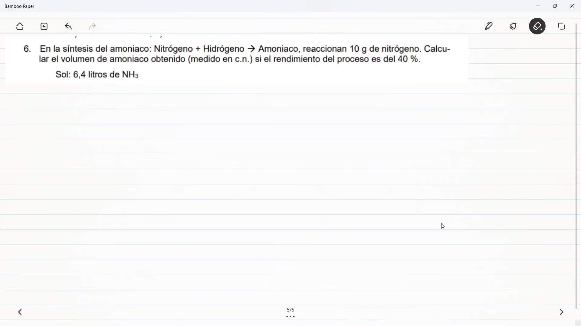 Siguiente paso, queremos pasar de moles de amoníaco, que está en estado gas, no lo he puesto aquí precisamente, pero esto es gas, todas las especies en esta reacción están en estado gas.