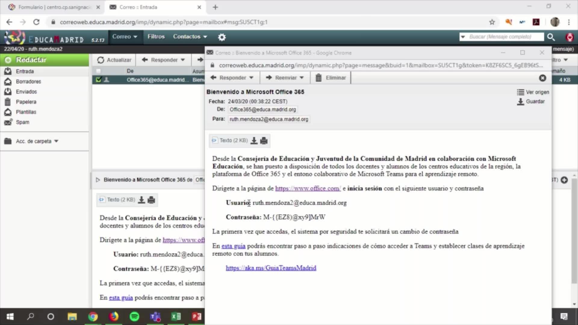 Voy a entrar en el correo de EducaMadrid y veis que tengo aquí un correo de Office 365 que dice bienvenido a Microsoft Office 365. Aquí es donde yo tengo mi usuario y mi clave de Teams. Vuelvo a decir lo mismo, EducaMadrid y Teams, dos cosas distintas. Pincho aquí.