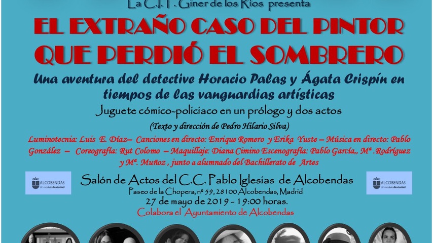 El extraño caso del pintor que perdió el sombrero. Una historia cómico-policiaca en tiempo de las vanguardias artísticas. Obra estrenada en el CC Pablo Iglesias el pasado 27 de mayo de 2019 representada por profesores, alumnos de nocturno, y madres del AMPA, y escrita y dirigida por el profesor Pedro Hilario