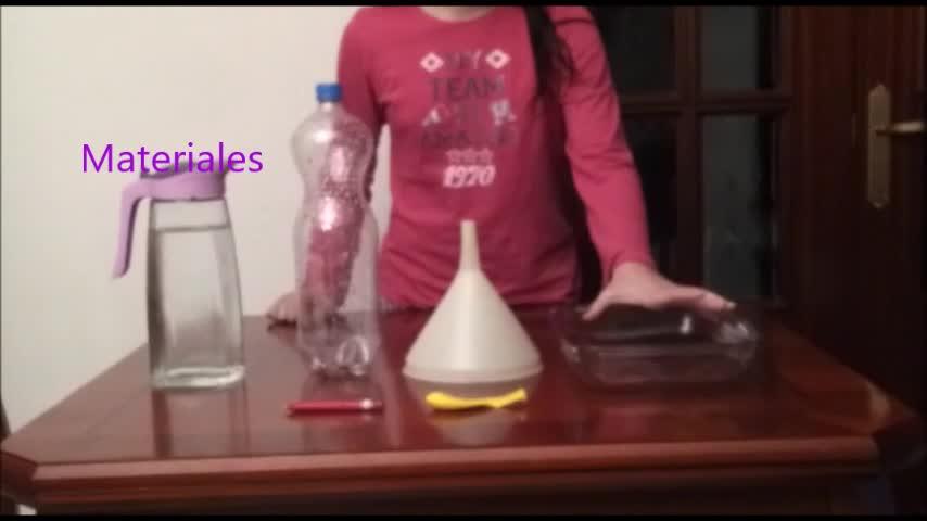 Para este experimento necesitamos una fuente, un embudo, una botella de plástico con su tapón, agua, un globo y un buzón.