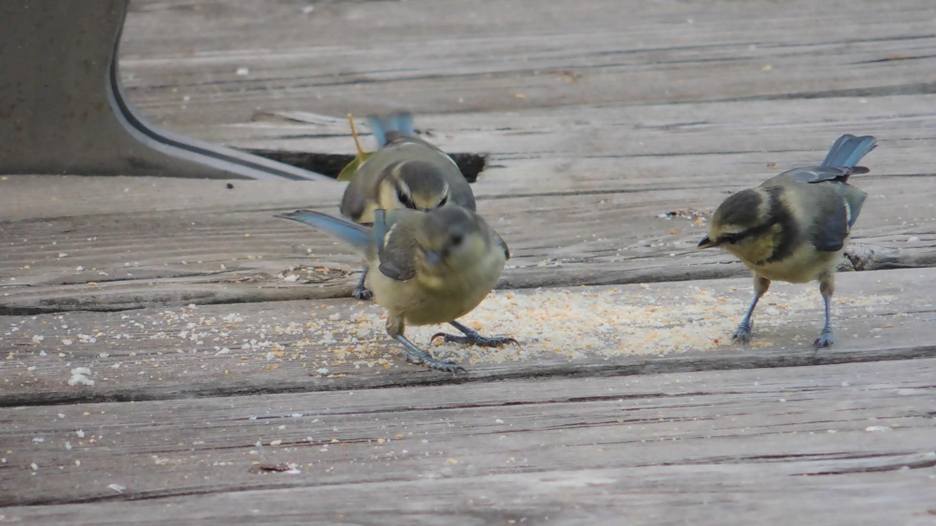 Unos jóvenes herrerillos comunes, Cyanistes queruleus, picoteando migas de pan sobre una de las pasarelas peatonales del Parque Lineal del Manzanares.
