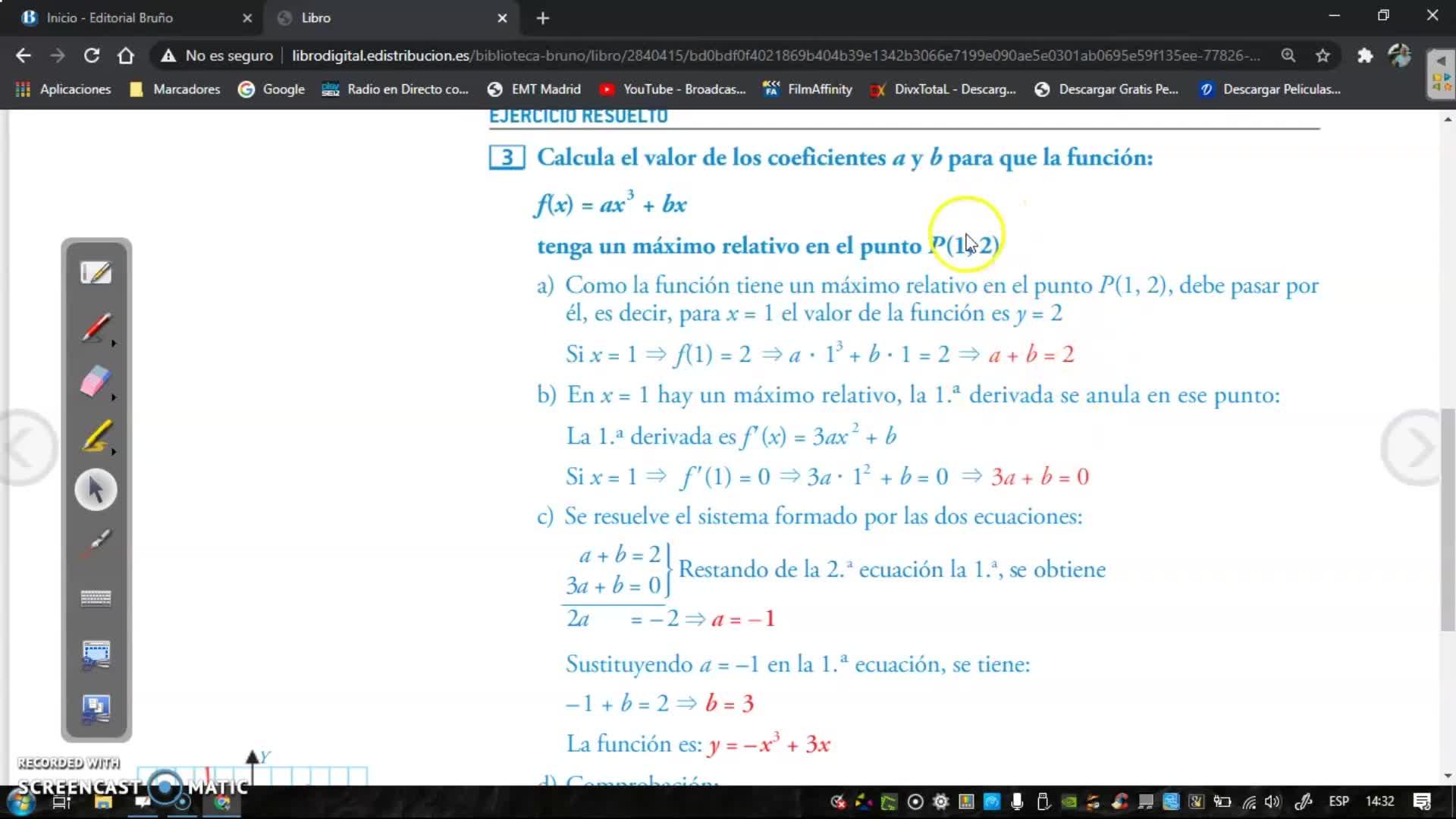 Hay que calcular los coeficientes a y b, o sea, dos números, para que esta función, ahí están a y b, tenga un máximo relativo en este punto.