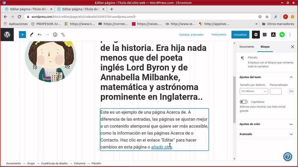 Por ejemplo, voy a poner aquí una página de biografía de esta señora. La foto la voy a cambiar. Ahora ya no haría falta subirla, voy a poner la misma foto que ya he puesto antes.