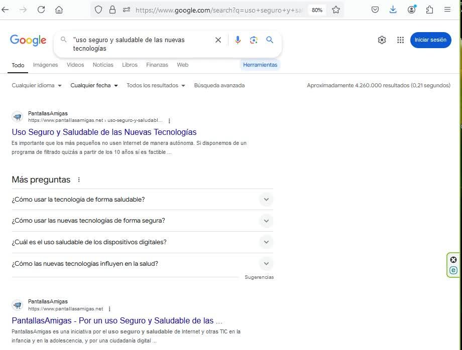 Para saber el número de resultados que se obtienen al hacer una búsqueda, por ejemplo, uso seguro y saludable de las nuevas tecnologías, simplemente tendremos que darle al botón herramientas.
