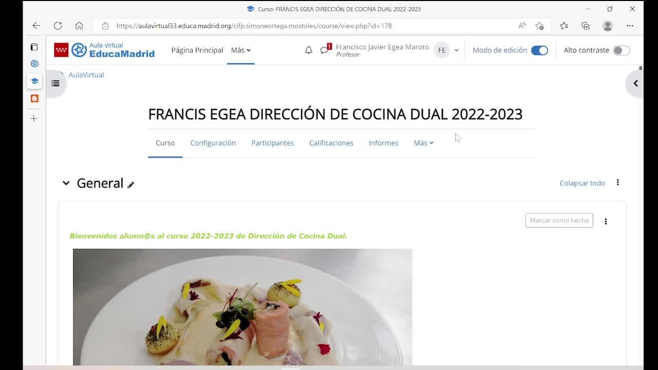 vamos a ver cómo se realiza eso. Bien, entramos en dirección de cocina, ya estamos en nuestro curso, lo primero que haremos es cambiar el rol, que como veis lo habíamos dejado en estudiante,