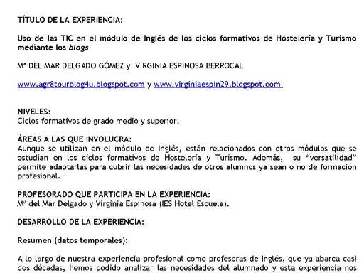 Ponencia de Dª.Mª Mar Delgado Gómez y Dª.Virginia Espinosa Berrocal: "Uso de las TIC en el módulo de Inglés de los ciclos formativos de Hostelería y Turismo mediante los blogs" realizada en las II Jornadas de Integración de las TIC en las Enseñanza, el 31 de mayo de 2010.