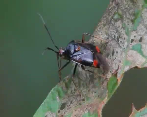 Una chinche de la especie Deraeocoris ruber, limpiándose el larguísimo rostrum con las patas.