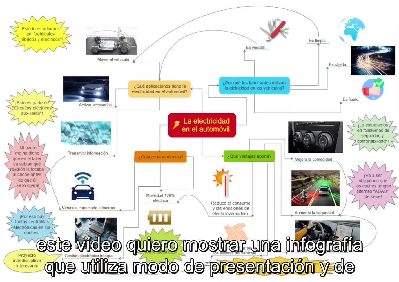 Infografía de la electricidad en el automóvil subtitulada - Contenido educativo