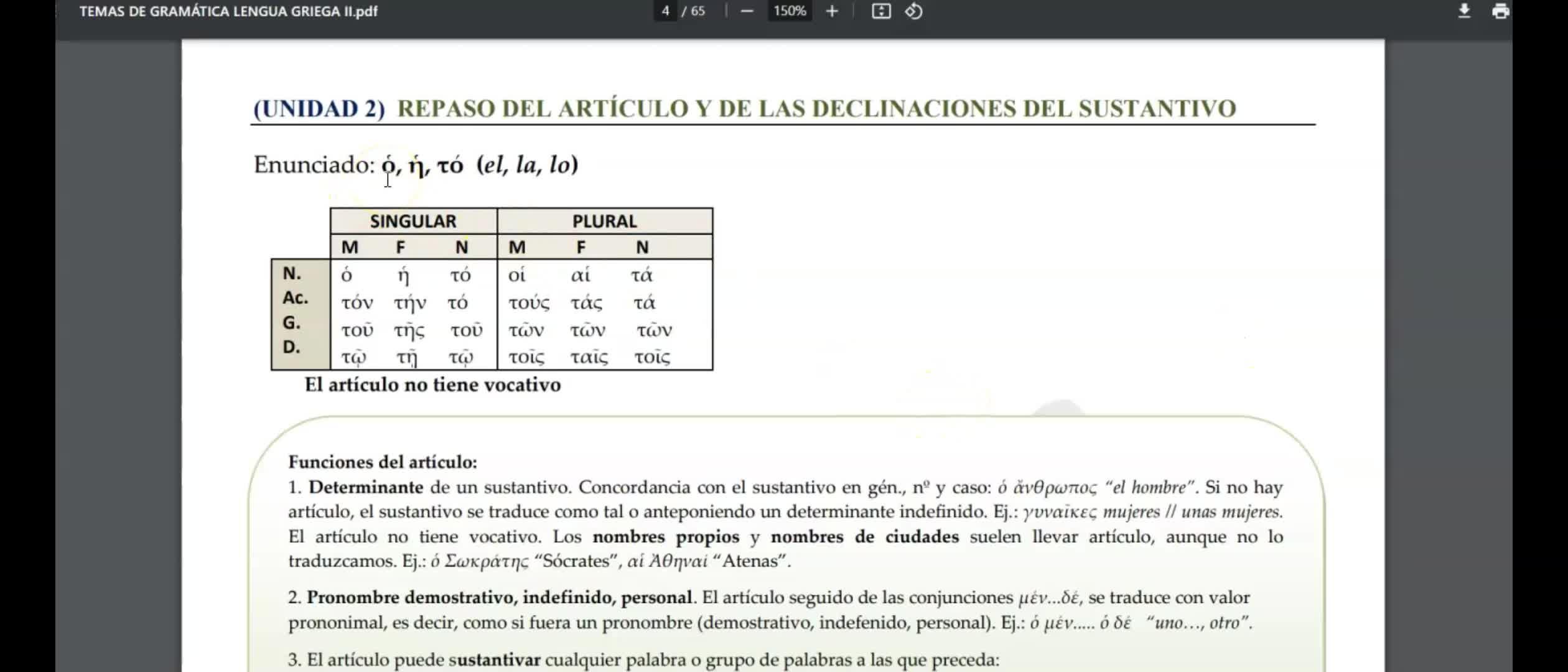 En este tema vamos a repasar el artículo, como se dice en griego el, la, lo, se enuncia así, jo, ge, to, jo, el, ge, la, to, lo, masculino, femenino y neutro.