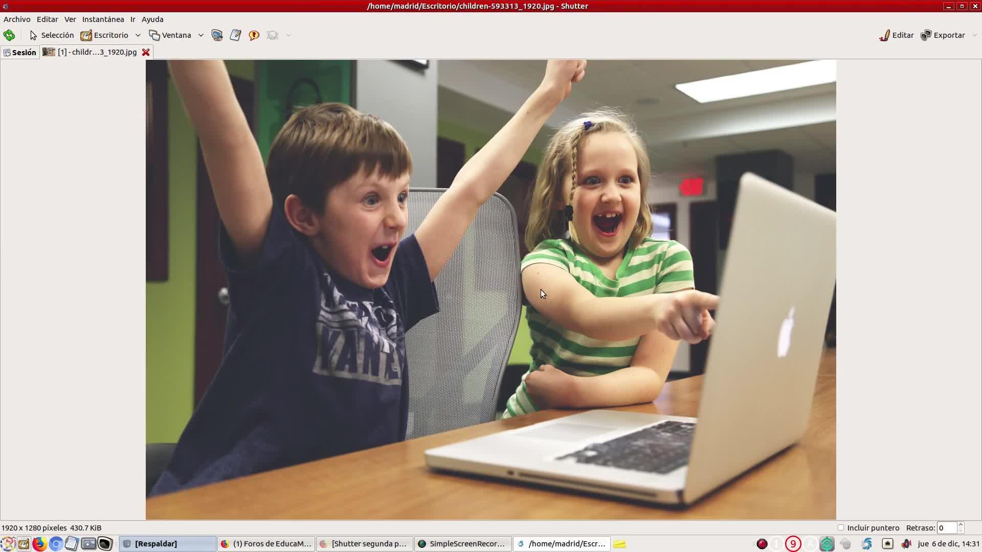 Podemos ir a Archivo, Abrir y Buscar la imagen o, en este caso, la tenemos en el escritorio, la podemos arrastrar y llevar a Shutter.