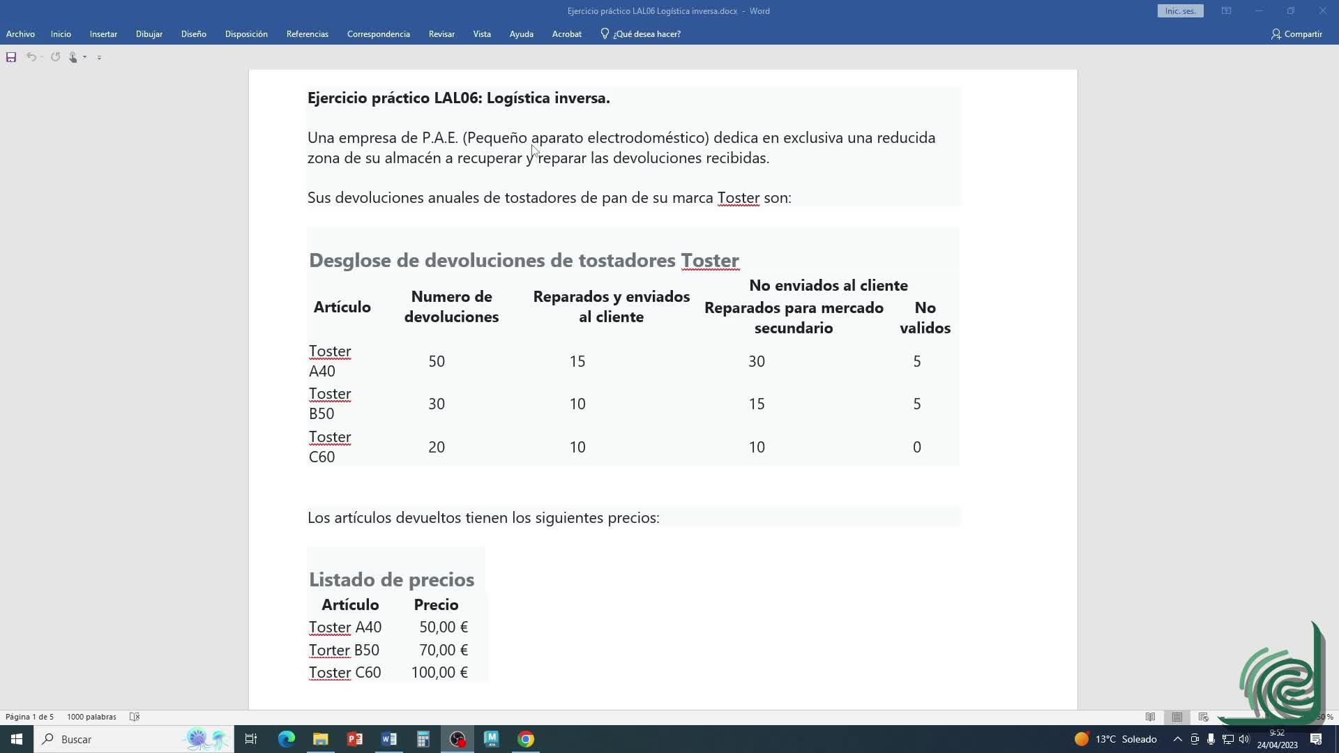 Buenos días a todos. Vamos a hacer una explicación detallada del ejercicio de la unidad 6 de logística inversa.