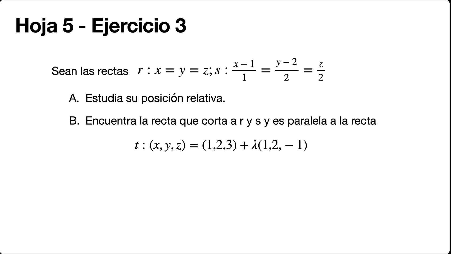 Como vemos, nos dan dos rectas R y S en su forma continua y nos piden estudiar su posición relativa