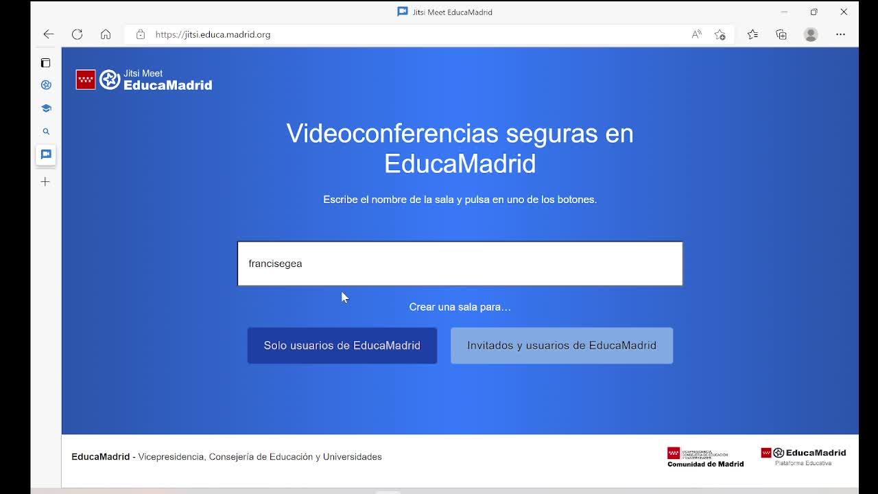 Lo primero que haremos es ponerle un nombre a la sala y vamos a entrar como solo usuarios de EducaMadrid.