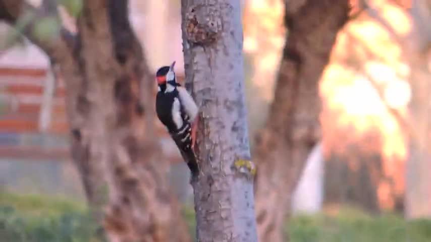 Los picos picapinos, dendrocopos mayor, trepan ágilmente por los troncos de los árboles gracias a sus fuertes uñas y a su cola corta y muy resistente, en la que se apoyan continuamente.