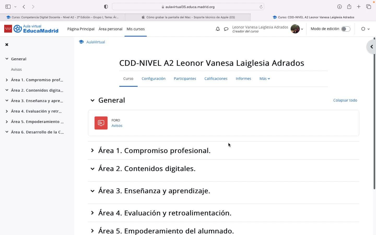 Hola, voy a explicar el trabajo de la última tarea, de la tarea 6, que es grabar la pantalla del trabajo que he hecho en el aula virtual que he regalado para el curso de DGT La Ejección.