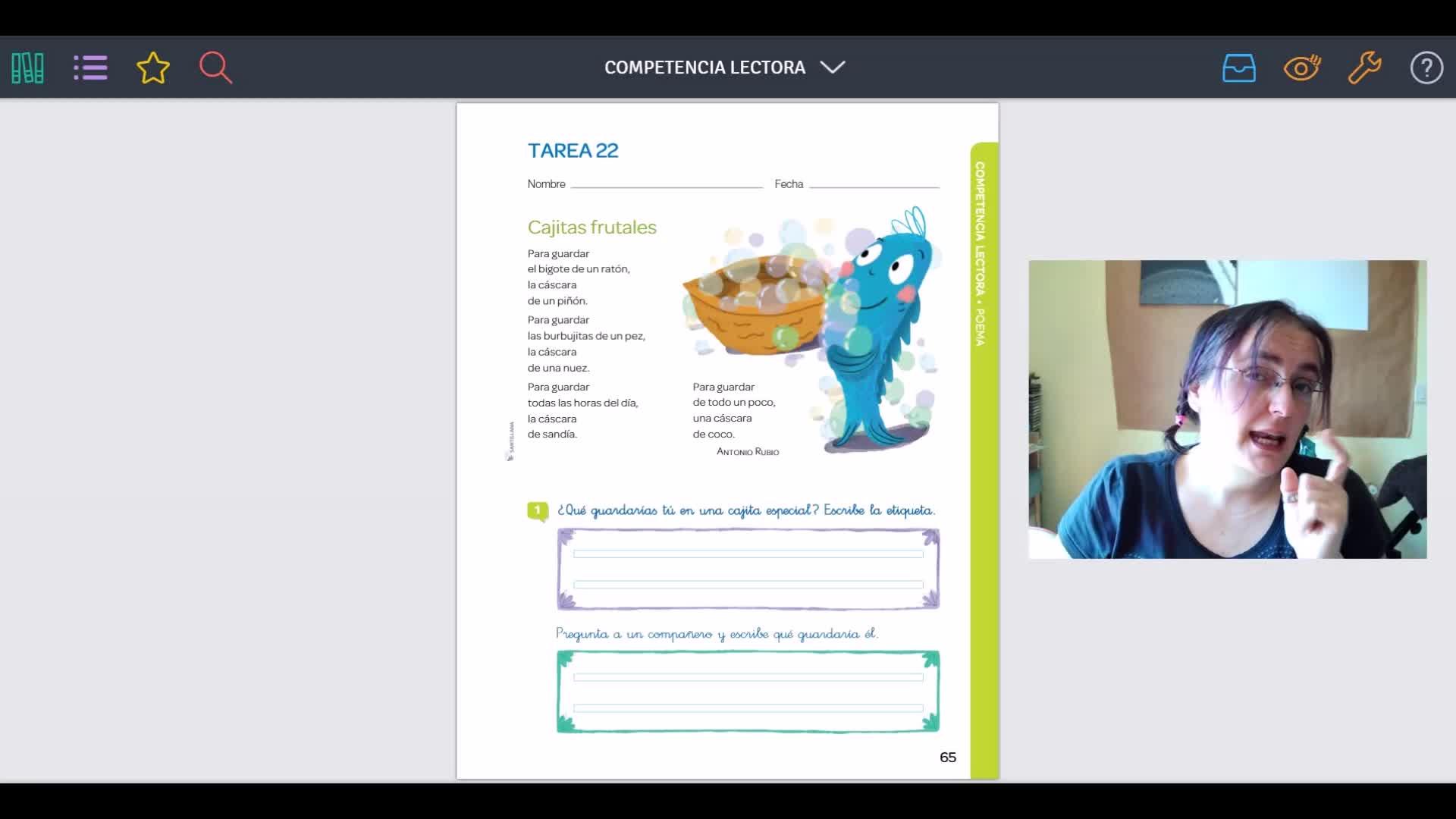 Bien, vamos a ver nuestra tarea que la tenemos en la pantalla y vamos a ir viendo qué palabras riman, ¿de acuerdo? La poesía se llama Cajitas Frutales, me encanta desde que la vi en el libro, la verdad que me parece chulísima y tenía muchas ganas de hacerla.