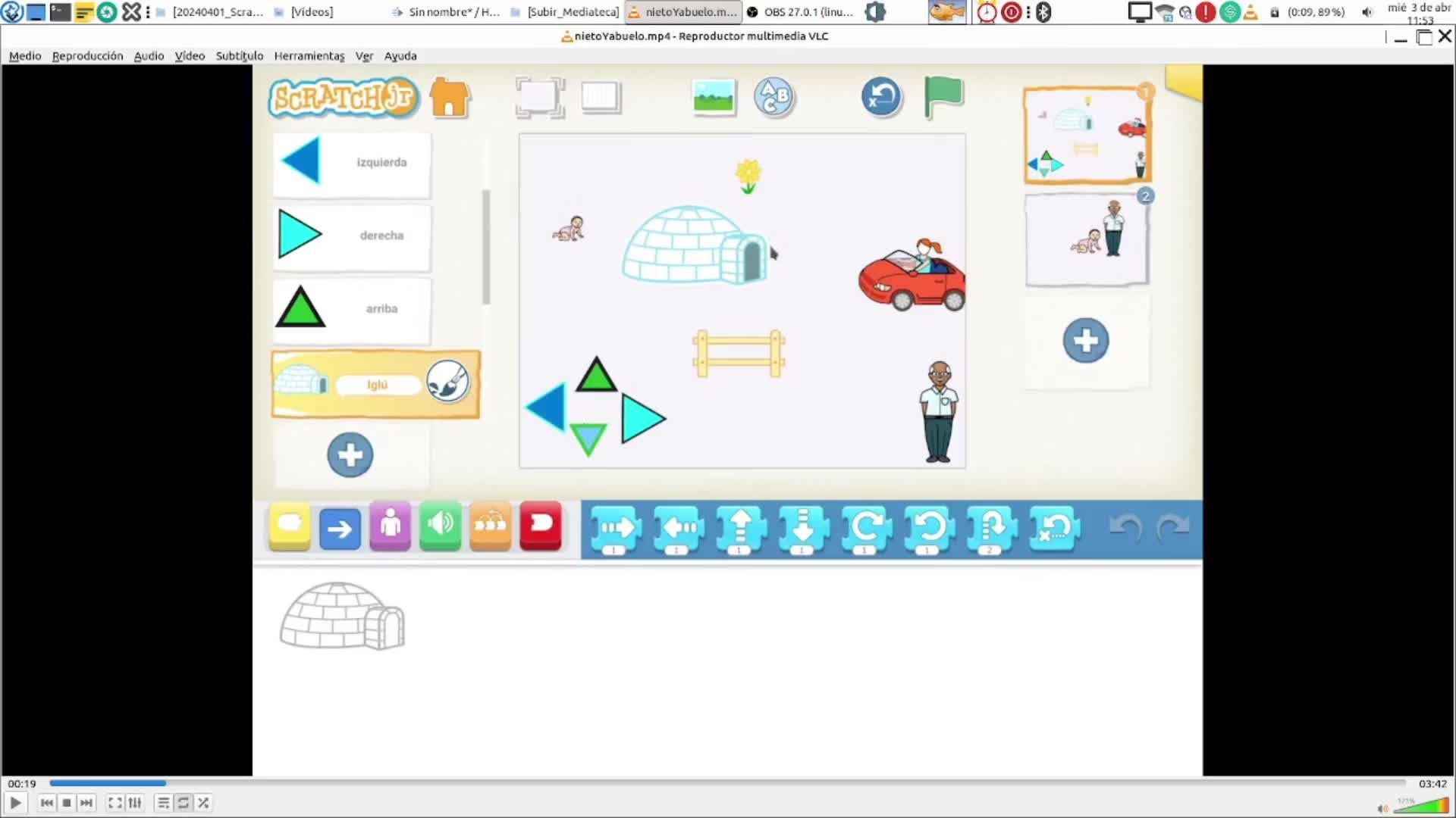 En este caso ya no va a programar el desplazamiento del bebé con estas herramientas, con las flechas,