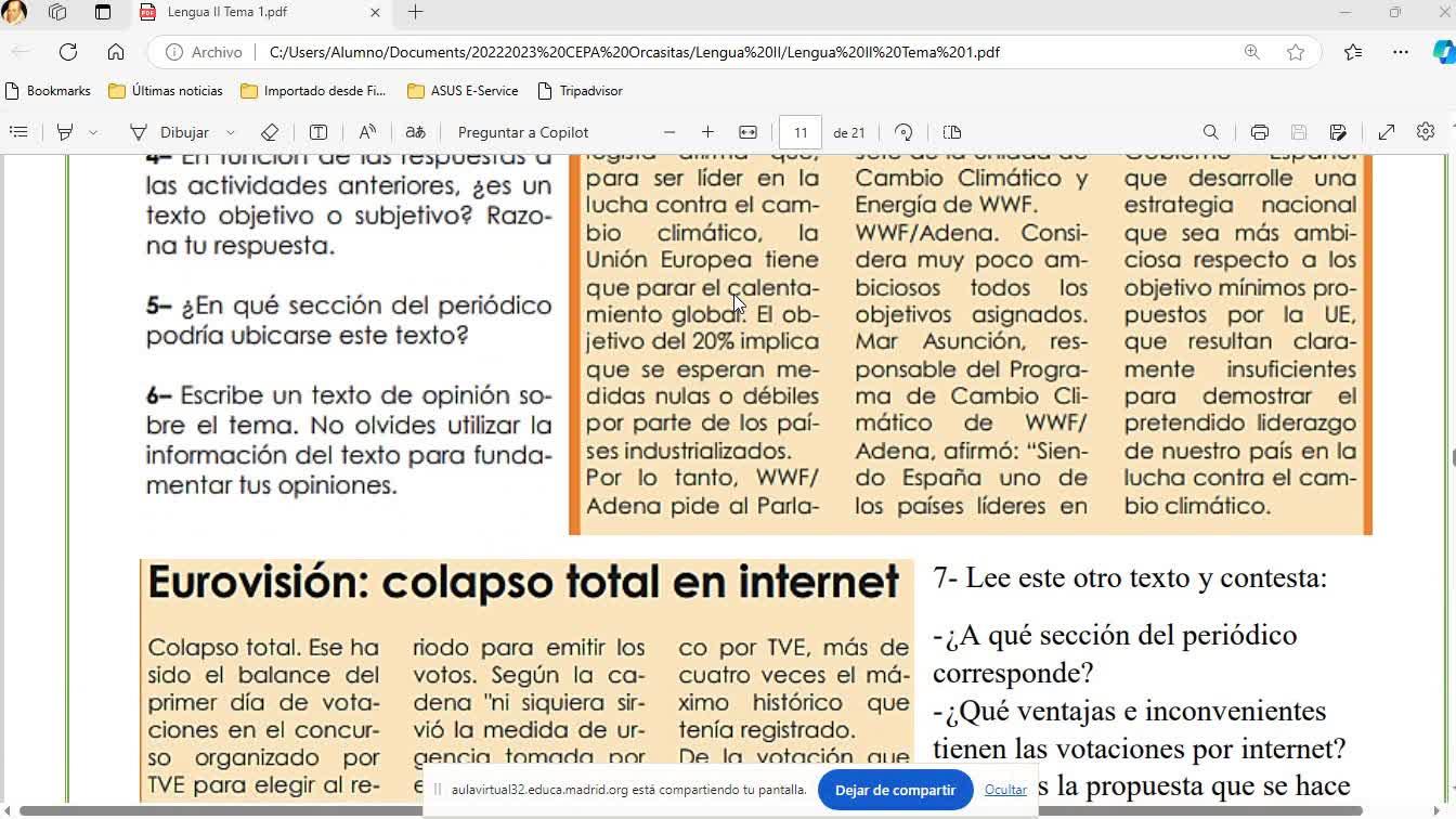 Buenas tardes. Esto es una clase de lengua nivel 2, distancia, en la que continuamos con el tema 1 a continuación de los ejercicios que hicimos de los textos periodísticos de la Organización Ecologista y de Eurovisión.