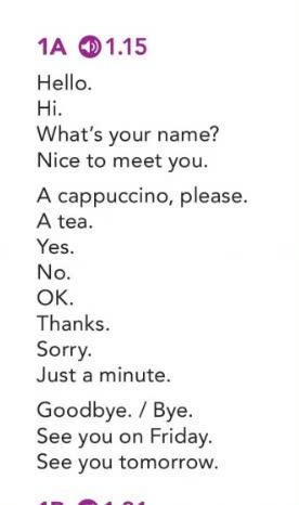 1.15. Hello. Hi. What's your name? Nice to meet you. A cappuccino please. A tea. Yes.
