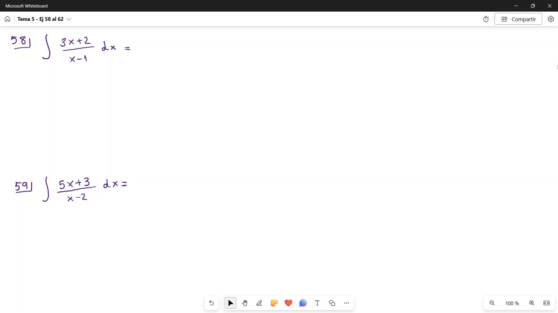 Vamos a ver los ejercicios del 58-62 que son integrales de funciones racionales en las que el numerador es del mismo grado o de grado mayor que el denominador.