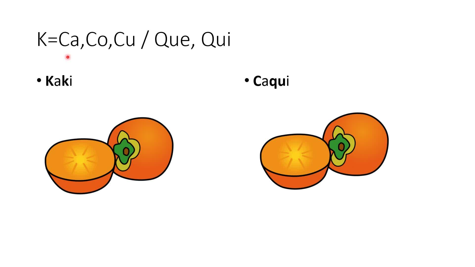 ante la E y la I, QUE, QUI. Así la palabra KAKI se puede escribir con K, KAKI, o con C y U, KAKI
