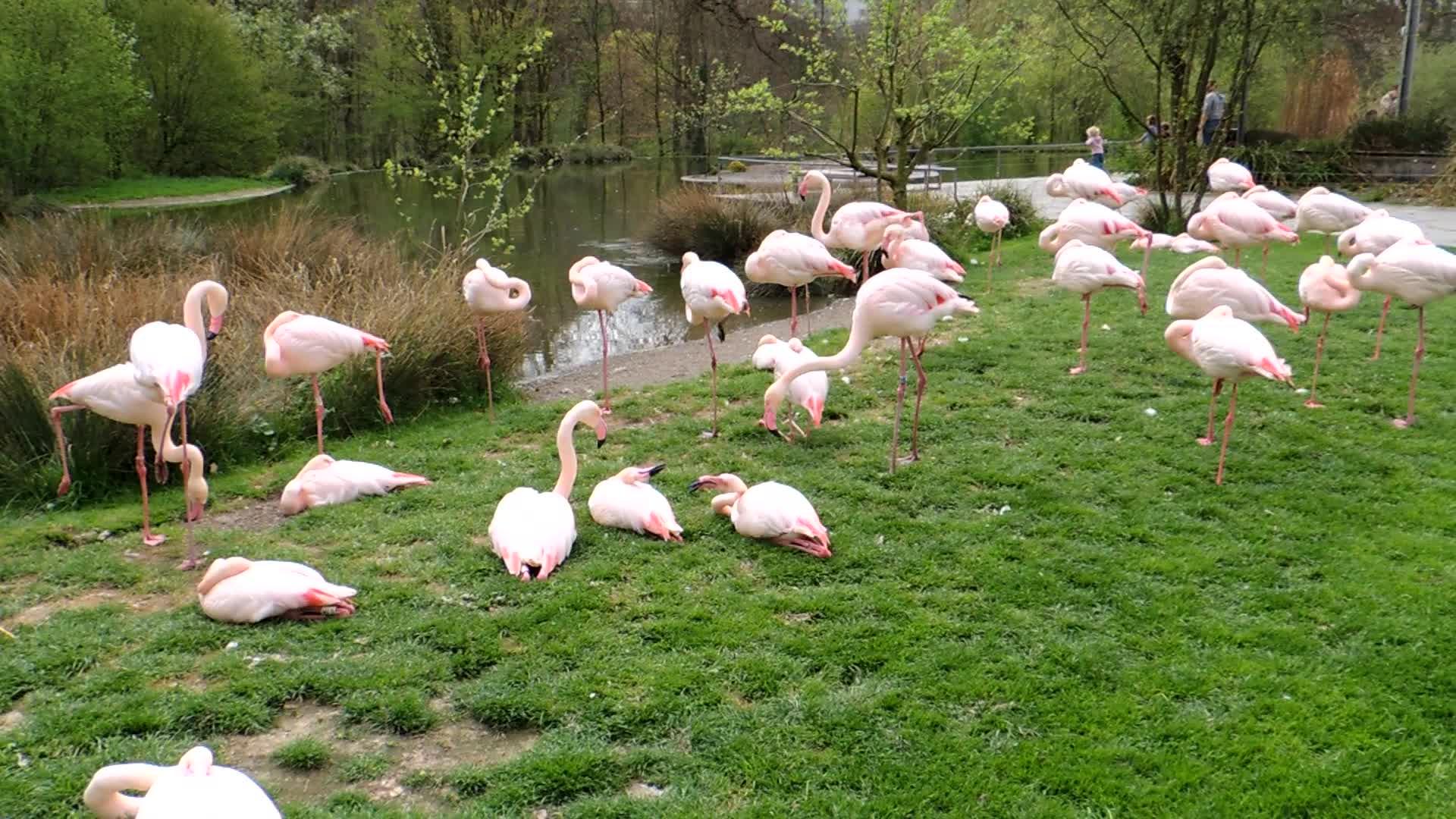 Un grupo de flamencos comunes (Phoenicopterus roseus) en el zoo de Berna.