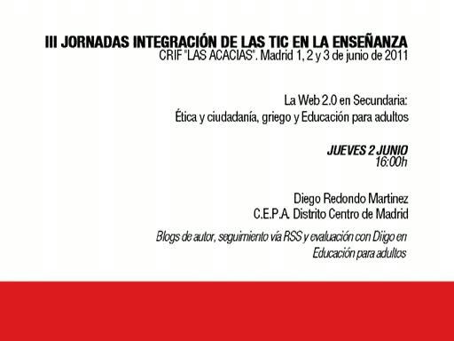 Ponencia de D. Diego Redondo Martínez: "Blgs de autor, seguimiento vía RSS y evaluación con DIIGO en Educación de Adultos" realizada en las III Jornadas de Integración de las TIC en las Enseñanza, el 2 de junio de 2011.