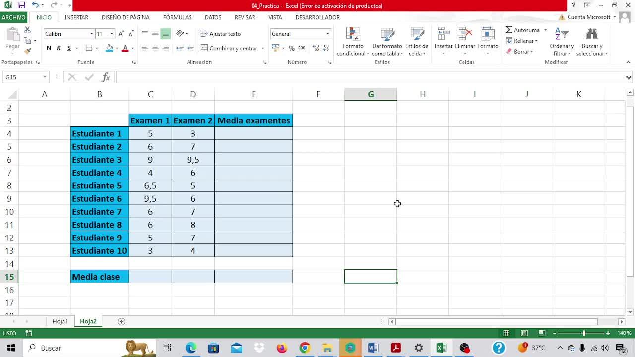 No es media. La función es promedio, que muchas veces es objeto de confusión. Sería promedio y el rango. Tan sencilla como la función suma. Cogemos el rango de las dos notas que tiene el alumno y ya está.